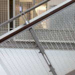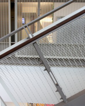 Combining two different crimping styles, the FPZ-16 wire mesh used at Frank A. Cassell Hall has rectangular openings more than three times as long as they are tall. The orientation of this weave makes a strong design statement. Where the infill panels are installed parallel to the staircase’s slope, the long diagonal lines formed by the mesh pattern slice into the vertical and horizontal lines of the glass façade’s frame. The layering of these lines brings a sense of depth and texture to this modern space. Where installed vertically, the mesh’s aspect ratio noticeably deviates from that of the façade, creating a geometrically interesting relationship.