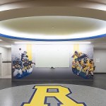 A Design Buzz for the Yellowjackets From the gridiron to the dorms, the University of Rochester boasts bold and unified athletics branding. Advent balanced Yellowjackets history with a clean, contemporary aesthetic — tying past and future together with cohesive design elements. An All-American wall at Fauver Stadium honors former and current athletes, while action graphics in the stadium and alumni hall spaces add a vivid sense of motion. The student-athlete residences at Genesee Hall feature a sleek design with a double stripe inspired by current branding, as well as a new hexagonal wall pattern Advent designers used for visual depth. By balancing respect for a deep athletics tradition with an eye to the needs of today’s student-athletes, Advent delivered designs across three spaces that meet individual design demands and work together as a whole.