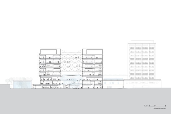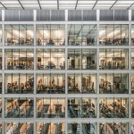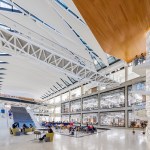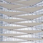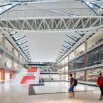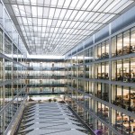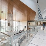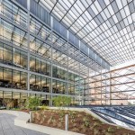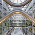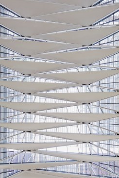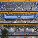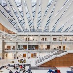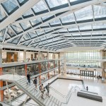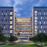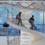 Given the school’s strategic and programmatic needs, the building is organized into two nine-story limestone and glass towers, acknowledging the substantially different requirements for labs, offices and work spaces of the Department of Electrical and Computer Engineering and interdisciplinary graduate research. The two towers, with inwardly-oriented glass curtain wall facades, are connected by an enclosed three-story atrium with a folded glass and steel roof, creating a vibrant, light-filled public space, which is the social heart of the building meant to facilitate “productive collisions” between faculty, staff, students and campus visitors. Bridges and staircases create circulation paths throughout and join the different research environments. Prominently visible through floor-to-ceiling glass along the north wall of the atrium is the National Instruments Student Project Center, dedicated to project-based interdisciplinary learning. Its honest expression of raw concrete, fully exposed mechanical systems, and glass walls from room to room puts engineering, and engineering education, on full display. Architectural gestures throughout the building were designed to elevate and celebrate engineering principles – from the steel truss systems spanning the towers to the intricate spiral staircase, from the delicate “V” column underneath the staircase to the sky bridges connecting the floors.