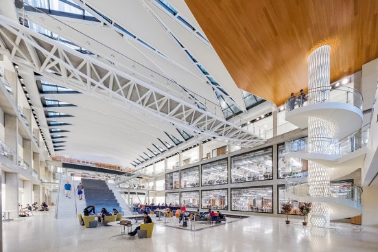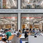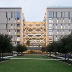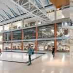 Ennead Project Designer Alex O’Briant explains, “The design of this project began with establishing the basic drivers, as programmatically there were two research environments that had to function in specific ways. Every other architectural move was made to undo the separation of the two towers and stitch these carefully crafted compartments together into one single cohesive engineering community, through a series of unifying gestures and an emphasis on transparency. We created physical and visual connections throughout and anchored them with a massive, open, light-filled atrium at the center of the building that exposes all the layers of activity going on within the building.”