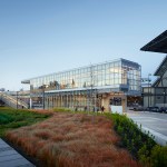 The project includes a train platform 100 feet underground, accessed by escalators and elevators from a two-level glass entrance structure at grade. Along the way, users pass through a tall, vertical circulation chamber featuring “Subterraneum,” an art installation by Leo Saul Berk, who worked with LMN to blend architecture and sculpture in expressing the geological layers of soil surrounding the station walls.