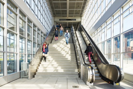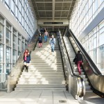 Where the bridge meets the above-grade station entrance, pedestrians can enter the station directly on the upper level by elevator or escalator, or use a grand staircase to access the station’s exterior plaza shared with Husky Stadium.