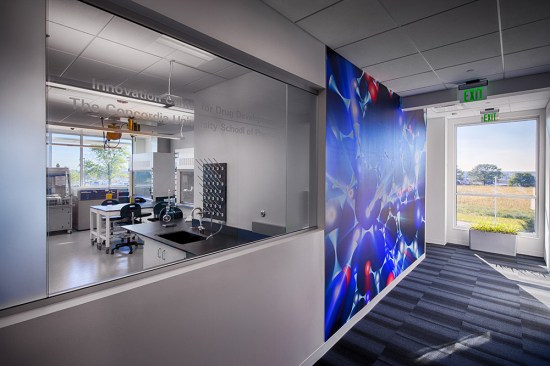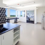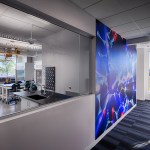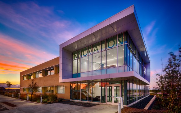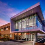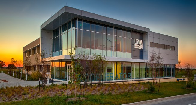 As a result of a grant awarded by the Economic Development Administration to the City of Wauwatosa and the University of Wisconsin-Milwaukee Real Estate Foundation, the University constructed the first building within Innovation Park. The UWM Innovation Accelerator is a place where business and industry meet academic research to move science to application for the new century. Positioned to beckon business park visitors, the clear and precise expression of the architecture and materiality pledge a seriousness of purpose and intent to the business community. Tenants within the building represent a variety of campus and local startups with research projects focused on prototyping and rare diseases and transplant technology including the University of Wisconsin-Milwaukee, Concordia University, Bridge to Cures and TAI Diagnostics. Glassy collaborative spaces welcome like-minded research and emerging technology partners, while the building layout promotes synergies between groups, allowing processes to quickly run from design to prototyping to testing. Several wet and dry labs make up the building, including a CNC and 3D printing lab, as well as offices and collaborative spaces. The precise white paneled façade, expansive window configurations and clean geometric lines underscore the building’s connection to innovation and technology. The design celebrates the facility’s use and function through enduring materials and systems that deliver high-performance results. To achieve LEED Silver Certification, the building is positioned for maximum PV solar gain with south-facing windows and external shading. Landscape solutions integrate traditional species that do not require irrigation. Labs and offices are strategically positioned, minimizing direct east/west exposure for even lighting and controlled solar gain. Sustainable strategies include stormwater management, a 25kW PV solar array, green roof, white EPDM roof membrane, exterior sunshades, extensive daylighting, heat recovery chiller and high efficiency condensing domestic hot water heaters and boilers. These selections have resulted in a 31% reduction in water usage compared to a typical office, 21% less energy usage compared to typical laboratories, and 30,000 kWh of energy production per year through the photovoltaic array, which equates to powering three homes for a one-year period.