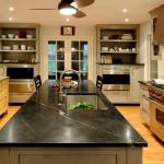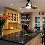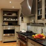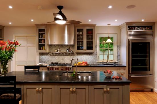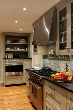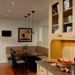 Before renovation, this house had two very small kitchens. One for the house and one for the teenager/rec room – a converted garage. The goals of the project were to connect the kitchen better to the dining room, open it more to the real family room and make the rec room more useful by removing the second kitchen. A secondary goal was to provide a breakfast station for coffee and bagels that could be used without getting in the way of someone in the main kitchen work area. The opening to the dining room was widened and filled with sliding glass pocket doors. A new banquette was placed adjacent to the family room, opening the kitchen to the family room, separated only by the high back seating, in a cased opening. The breakfast station was treated as a separate piece of furniture, complete with refrigerator drawers, storage for coffee, plates, silverware and coffee maker, all hidden in the hutch like element. Flanking the doors to the dining room are two pieces of furniture that hide the oven and microwave as well as provide enormous storage. And of course the rec room was opened, dormer skylights added and connected more to the kitchen as well as the rest of the house with a hidden door into the dining room.