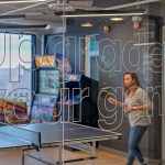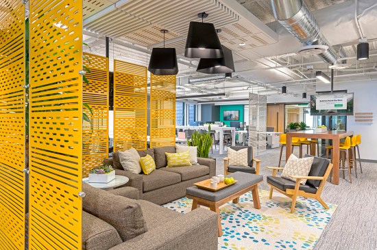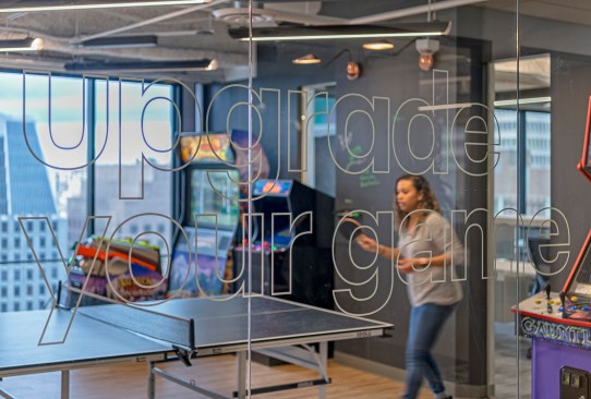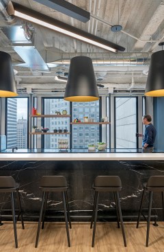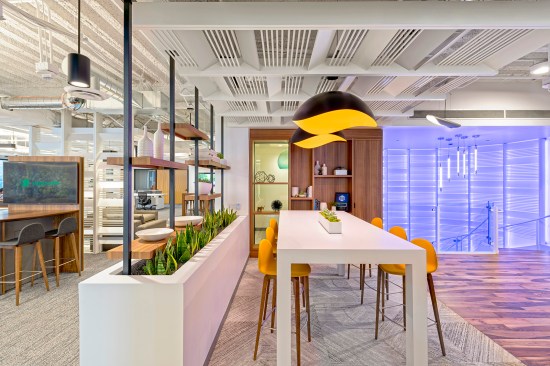 A sophisticated color and materials palette evokes a sense of seriousness and maturity that distinguishes Upgrade from the traditional technology start-up and signifies its evolution into a world-class brand. High-end finishes and custom furniture solutions are balanced with playful game rooms and fully stocked snack pantries dedicated to enhancing the staff office experience. French walnut flooring and doors provide a soft luxurious complement to Blitz-designed custom furniture pieces. With a focus on residentially inspired (aka “resi-mercial”) lounge seating and décor, the space is inviting and comfortable.