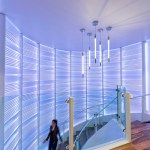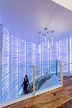 A feature stair, made of semi-translucent resin fins back-lit with color-changing LED lights, connects the two floors. The spiral staircase intentionally contrasts with the minimalist aspects of the executive office and board room by allowing for a dynamic display of color and texture. Open seating for casual meetings or impromptu gatherings are landing points on either end of the stair, allowing staff to naturally congregate at the junction between the floors.