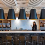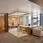 The free-flowing open office plan takes a nonlinear shape, intentionally skewing the direct path of travel to entice workers to meander through the various seating and workspace typologies. Glass and perforated screens provide an organizational framework that divides space without obstructing views or creating unwelcoming physical barriers between various departments. The layered approach creates a natural flow through the space that subtly creates distinct zones for each department without the creation of visual barriers or hierarchical structure. Careful consideration of the location of departments and amenities ensures client-facing spaces are appropriately arranged and that acoustic and security separation are seamlessly integrated. High-tech meeting rooms enable stronger collaboration, productivity, and communication. Each workspace varies in seating posture, materiality, and size to allow for a diverse range of uses: from open collaborative brainstorming to sit-down private focus work.