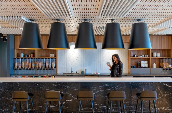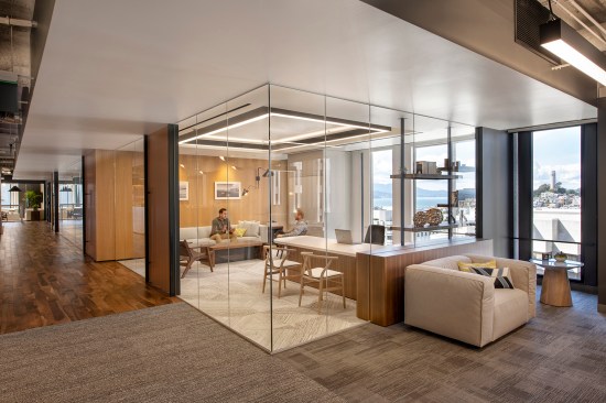 Visitors exiting the building elevators are greeted with a leafy living wall on one side and the inviting main entry on the other. A custom concierge desk and reception lounge instantly welcome visitors into the space. An expansive board room is situated directly adjacent to the reception area. Floor-to-ceiling glazing provides a visual connection between the two spaces while also creating a framed vantage of iconic San Francisco views, including Coit Tower, TransAmerica Pyramid, Ferry Building, and San Francisco Bay beyond. The same epic vista is shared by the CEO and founder’s office, which is enclosed on three sides by glass, directly reflecting the company’s mission of transparency and openness. Custom four-foot-wide off-set pivot doors made of quarter-sawn French walnut with black steel hardware provide an evaluated yet simple detail in the CEO’s private office, as well as in the main conference rooms and executive board room.