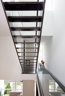 The solution was to incorporate a combination of skylights, vertical open volumes and transparent walls and floors throughout, allowing natural light down through the residence. Staggering these stacked volumes not only provided a continual sustainably smart light source, but also provided intimate spaces.
