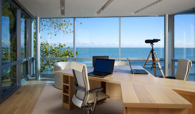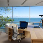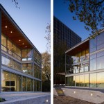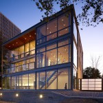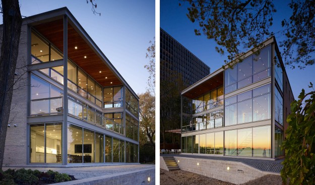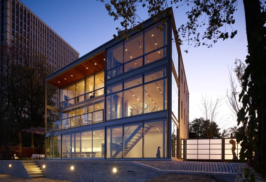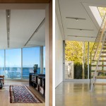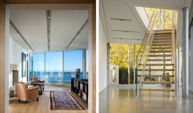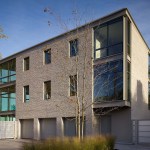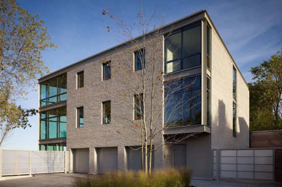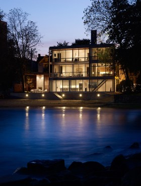 A glass and steel easterly wall stretches parallel to the shore to maximize lakefront vistas and connects the living spaces with the distant horizon. Away from the lake, the house maintains a more urban and protective character utilizing heavy masonry walls and smaller punched-window openings.