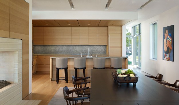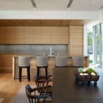 A single architecture and design team selected a neutral palette, inspired by weathered driftwood, which compliments the contrasting furniture. Natural plaster was used in lieu of paint on interior walls, providing a healthy indoor environment and subtly reflecting the light off the lake.