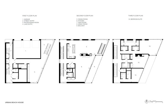 The ground floor includes garage parking, storage space, and an entertaining room with operable glass walls that open to the terrace and patio. An airy staircase ascends to the main floor. Primary living spaces and a gracious double-height balcony are on the second floor. Three bedroom suites are located on the third floor. A greenroof caps the building.