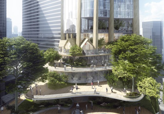 At podium level, we break down the typical massing of a retail/mall space, and introduce a human-scale, ‘mountain village’ that invites passersby to explore. Urban spaces are stacked vertically, and landscaped with lush green walls and trees to give visitors and residents alike, the feeling that they are in nature, rather than in the middle of the city. The tower rises up out of the village like a tree. Clad in transparent glass, it boasts an innovative wood façade structure (Glulam) that appears to be roots twisting upwards, reinforcing the tower’s organic shape; with sky gardens interspersed throughout that vertically extend the urban green.