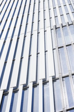 The 400,000-square-foot building contains 10 courtrooms, 14 judges’ chamber suites, administrative Court Clerk offices, the U.S. Marshals Service, U.S. Probation, and other federal agencies. Parking for both courthouses is on two underground levels. The building’s clear glass and anodized aluminum skin admits abundant natural daylight to the interior and provides views from within. Vertical aluminum sunscreens on the exterior temper this transparency with a variable protective veil that modulates quietly with the passing of the sun. Vertical fluting of these delicate elements refers subtly back to the classical orders of the Frank E. Moss Courthouse and to the broader traditions of the judiciary.
