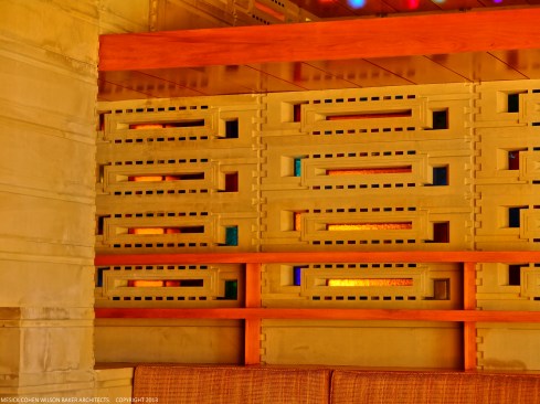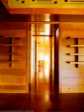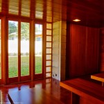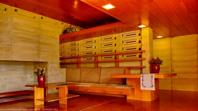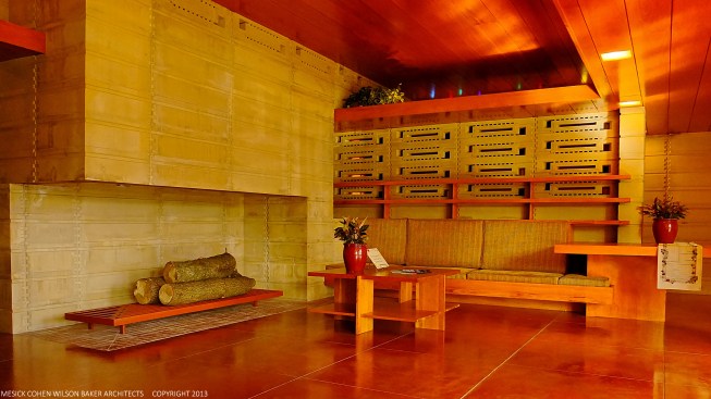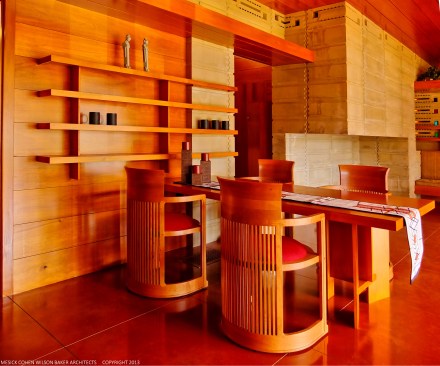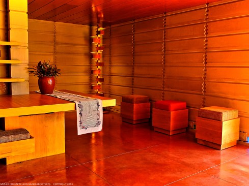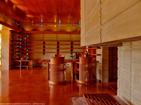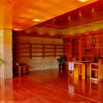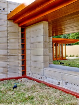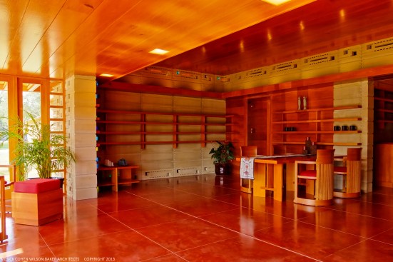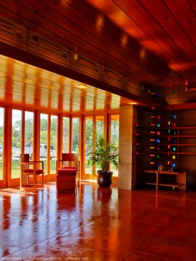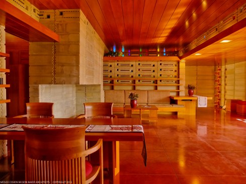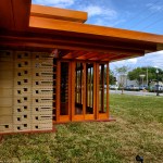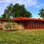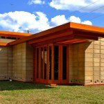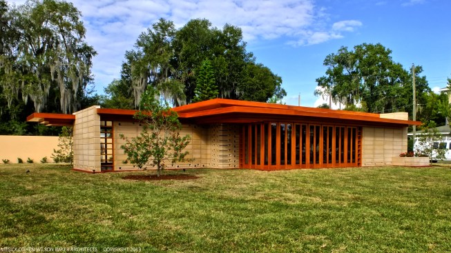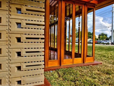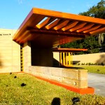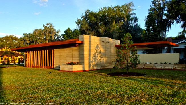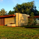 The schematic design of the Usonian Faculty House was conceived by Frank Lloyd Wright in 1939 for the campus of Florida Southern College. After a 74 year delay, the house has been finally realized and opened in October, 2013. It is one of three parts comprising the Sharp Family Tourism and Education Center, which will promote and educate visitors of the largest collection of Wright buildings in a single location. The other two architectural features include a restored 1930’s Bungalow House that will serve as the new campus Gift Shop, and site design that will include a fountain, reflecting pool, courtyard, trellis, planters and landscaping. Extensive use of the Wright concrete textile block construction method was implemented.