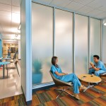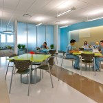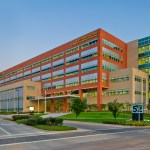 The exterior forms and materials – a mid-rise modernist building in brick and glass — reinforce the sense of campus extending the architectural vocabulary of the other facilities in the Research Park Complex and setting the stage for future development. The interior palette brings the clean contemporary design inside. In the patient reception areas and clinics the neutral backdrop and soft colors and materials of the furnishings create a quiet soothing environment. A brighter color palette enlivens the classroom and labs for the students. Throughout the facility color and architectural elements are used to improve wayfinding for the patients.