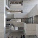 Educationally, a vertically layered strategy connects ground and sky. The larger volumes are placed nearest the ground, with the teaching spaces stacked and administration and professors’ offices positioned on the higher levels. The roof level contains the library, embedded in the linear ‘loggia’, enjoying panoramic views over the city and of the sea.