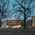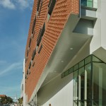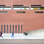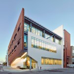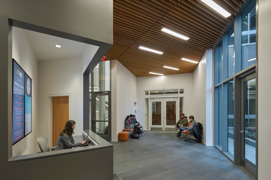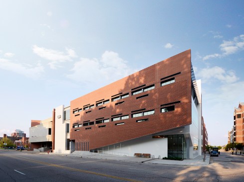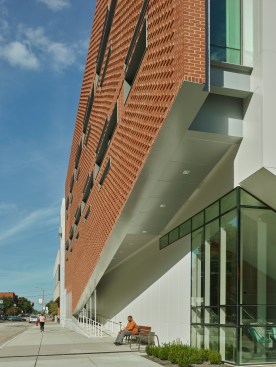 The Center provides traditional classroom and administrative space as well as simulated healthcare environments to train students for real-world community crises. The urban location, on a small site tightly hemmed in by existing Brutalist and Neo-Gothic university buildings and a city park, required both stylistic and massing innovation. The final three-story design tied together the existing structures into a cohesive campus, critically responding to and complimenting neighboring buildings through the interplay of exterior materials and the planes in which the materials are utilized. The west elevation brick plane, in particular, lifts to reveal a ramped entrance that opens to the street, framing views of the nearby park and providing an easily accessible entrance for students and visitors.