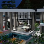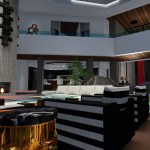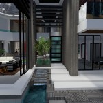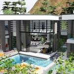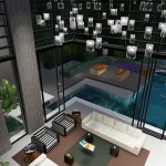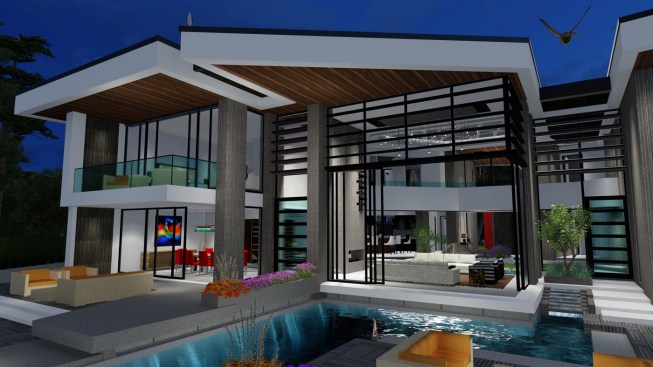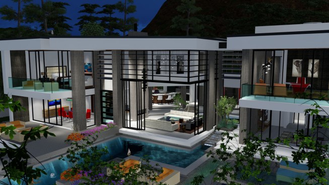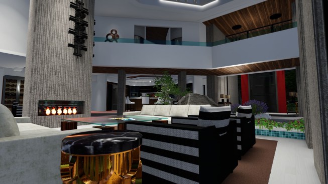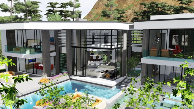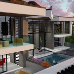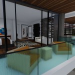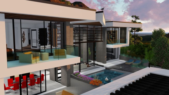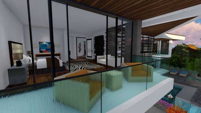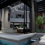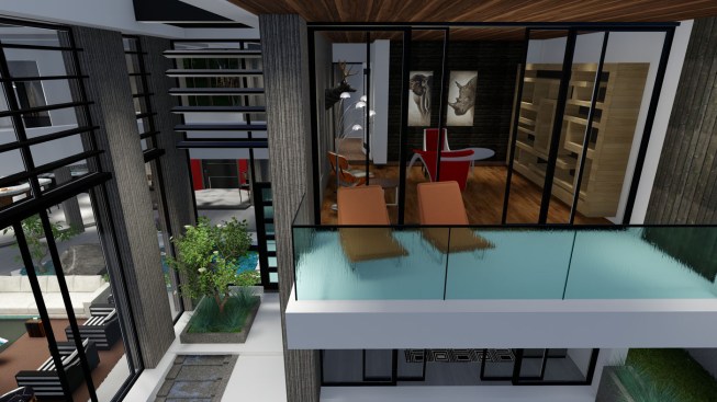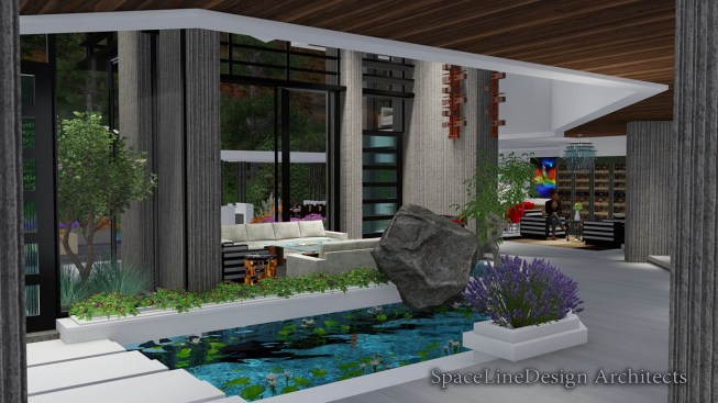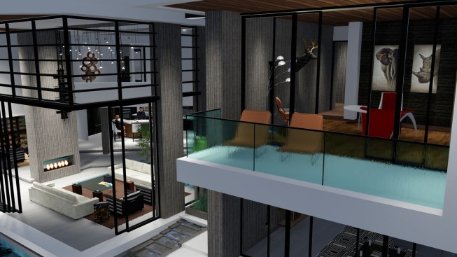 Step through the heavy bronze and leather pivot door into the two-story atrium / living room wrapped by the upper bedroom bridge walk- throw open the massive sliding glass window walls and open the house directly to the shimmering blue swimming pool and patio.