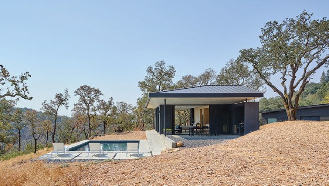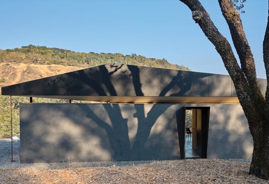 Designed by San Francisco–based firm Schwartz and Architecture, the Valley Rock Guesthouse is an exercise in impeccable taste and structural economy that provides accommodations for visitors to an estate in the Sonoma Valley. The project brief called for no more than a bedroom, bathroom, galley kitchen, and covered outdoor dining area on a site with sweeping views across the landscape.