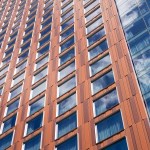 Weathered steel is a popular architectural material thanks to its rich, mottled appearance, but it comes at a high price. The architects at HKS Hospitality Group in Dallas, Texas, were reminded of this as they were in the process of designing the new JW Marriott Convention Center Hotel in Austin. The original concept for the building was to integrate natural materials that are found within the Texas landscape. For the façade of the 34-story primary tower, HKS │HG wanted a weathered metal appearance, but when the team saw the estimate to use weathered steel, they knew the price was too high—even for a luxury brand like JW Marriott.