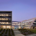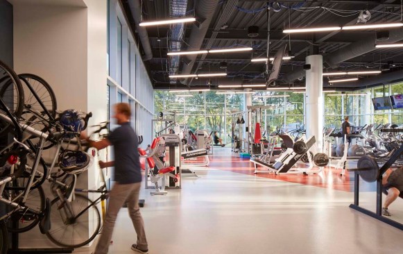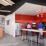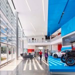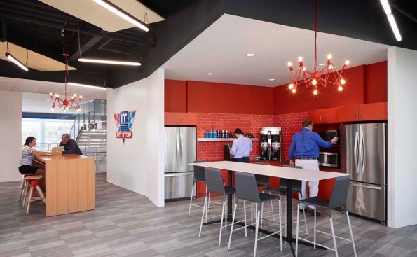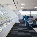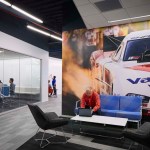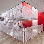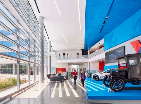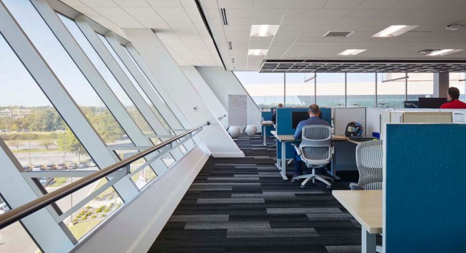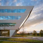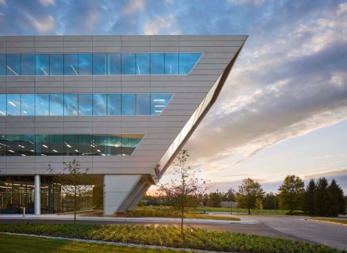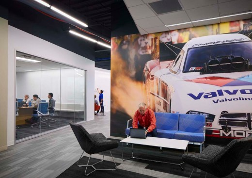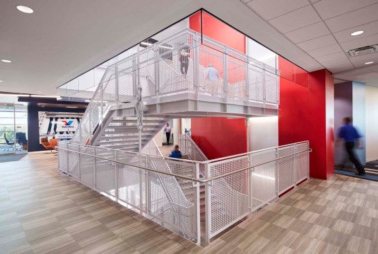 SCB has recently competed the architectural and interior design for Valvoline’s new headquarters in Lexington, KY. The 162,000-square-foot building was designed to support the growing company by creating a unique, open, and flexible workplace that reflects the legacy and future of the Valvoline brand. The design response is composed of two, four-story office bars connected by a central glass volume, forming a dynamic, V-shaped plan which embraces a vehicular drop-off court. The transparency of the ground floor allows the building’s mass to appear to float above the landscape, while the beveled ends of the office bars evoke a sense of movement and motion towards the surrounding landscape. Access to day light was a key design driver for the project. The uniquely shaped plan for the building, coupled with narrow floorplates ensure that all workstations have access to natural light. The glass connector serves as the social hub for the building, providing meeting rooms, breakout spaces, a pantry on each floor, and the formal entry lobby on the ground floor. The double-height lobby features an exhibition on Valvoline’s history and innovations in engine performance; flanking the lobby are the building’s shared amenity spaces including a cafeteria, fitness center, and conference/training center. A four-story open stair spatially links the lobby with the floors above, and offers employees an alternative to the adjacent elevators, and an opportunity to informally engage with colleagues.