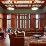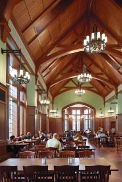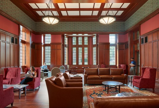 Stylistically, the college’s great room and dining hall echo similar monumental spaces at other iconic residential colleges. They are trimmed in mahogany paneling and imported William Morris–print wall coverings. The great room is furnished with leather armchairs and lush carpets. The dining hall’s ceilings appear as though they are supported by wood trusses, but those are nonstructural. Like the trusses,