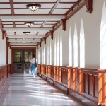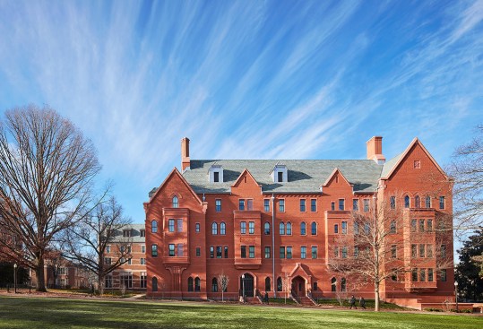 To encourage the sense of community that comes from random meetings between fellow residents, elevator use is discouraged. Instead, students use stairways that open onto the three quads, which they naturally cross on their way to class or to visit friends. The main quad is surrounded on all four sides by a Gothic arcade, while another is bisected by a stylistically similar open passageway.