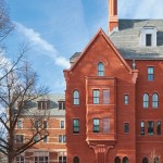 The building’s façade is composed in two aesthetics to “break down the scale,” says DMSA project manager Ramsay Fairburn, AIA. “It is a massive building. We didn’t want it to have great heaviness relative to the smaller scale of the buildings next door.” The main elevation of the building is burnt-umber-colored brick, with split-faced trim in local Crab Orchard stone, along with cut Indiana limestone for window surrounds and belt coursing. The rest of the façade is a deep-red brick, and appears to be from an older, more austere era, with comparatively simple detailing in a dark pink sandstone imported from India.