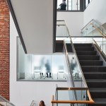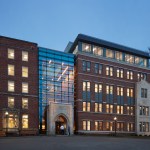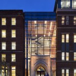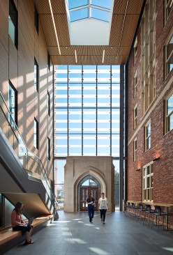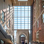 A new, four-story atrium connects Godchaux Hall, Frist Hall, and the Nursing Annex and serves as the School’s new main entrance and lobby. The glazed façade stitches together differing levels between the existing building and addition, highlights the juxtaposition between old and new, and fills the atrium with natural light. On the interior, a wood slat wall connects ceiling and wall elements and acts as an acoustical treatment in the active volume.
