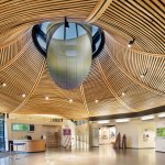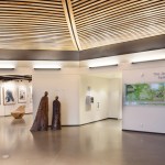 Devised to emulate the native orchid flower, the center of the circular atrium is a skylight oculus dramatically surrounded with horizontal wooden slats cascading down in the form of petals. Each organically-shaped doorway leads to a new building amenity. Whether gift shop, cafe, gallery or garden access, the gateways extending from the building core are accented by the B4 | arris4 indirect asymmetric providing indirect illumination onto the high curvature of the ceiling.
