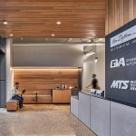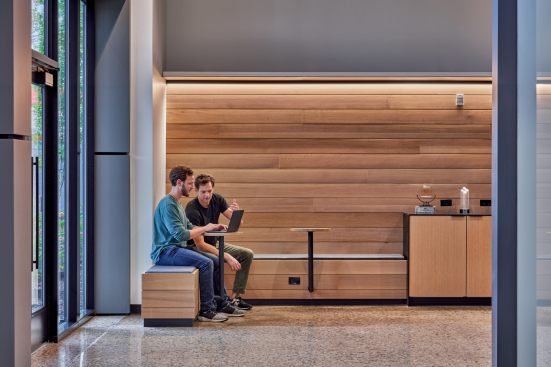 Exterior, natural materials carry into the building, welcoming guests with a modern, warm, industrial aesthetic. Guest seating is integrated into a minimal coffee bar in the main lobby, providing a touch-down area for quick greetings or space to work while waiting for a meeting.