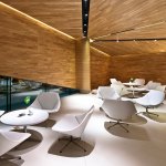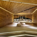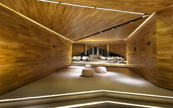 Materials are paired in contrast to each other such as Corten steel and glass on the exterior of the Triple V Gallery, white-oak walls and ceilings with cement floors in the interiors. An extension of the show gallery, the lounge area is where discussions are conducted. This space takes advantage of the panoramic views of the coastline and comprises a sculptural bar counter. Tectonically, the building responds to the coastal setting and is finished in weather-sensitive corten steel panels on its exterior and timber strips on the interior walls and ceiling for a more natural feel.