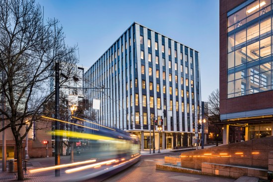 The Vanport Building is being designed to achieve a minimum of LEED Gold certification, with countless sustainable features. A green roof buffers rainwater and encourages biodiversity, while a large stormwater planter in the courtyard treats most water that falls on site. Solar panels on the roof offset energy costs; daylighting strategies include solar tubes and a narrow building form. A dedicated outside air system (DOAS) with radiant heating and cooling, as well as a robust building envelope, promote thermal comfort and efficiency for users.