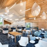 Inside, the new library provides countless opportunities for patrons to engage with the collections and the staff. In the highly active space, support for collaboration is abundant, while quiet spaces that foster concentration and creativity can be found throughout. Gathering and communal hangout spaces such as the grand community room and teaching kitchen punctuate the areas designed for self-directed access to information, research, and project production.