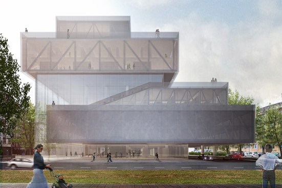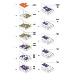 Staggered volumes containing traditional library programs, such as areas for individual concentration and areas for socialization, float within a permeable envelope to create open spaces, both indoor and outdoor, for social interaction.