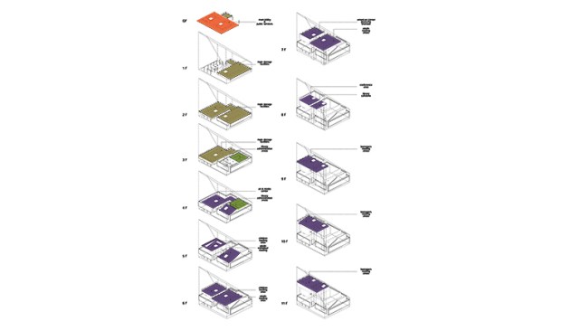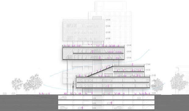 As a vertical urban plaza, it gathers visitors of all ages in an open and inviting environment. Through a seamless blend of interior and exterior, visitors are able to move deep into the building without loosing connection with the surrounding city.