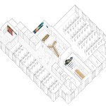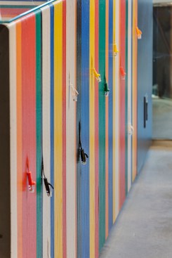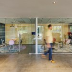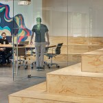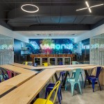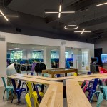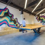 The new office is a colorful intervention in a 14,000sf ground floor space. Leveraging tall ceilings (as high as 14′ in certain areas), the office draws employees through a series of public spaces, and encourages encounters across teams, through both formal and informal gathering settings. From a dedicated play area in the break-room (including both video games on a 70″ screen and old arcade games) to meeting rooms that abandon a corporate feel and adopt a residential vocabulary, the ground is set for a workplace environment that fosters a new office culture for the company’s growing presence in North Carolina. The furnishings include a variety of custom elements, from raw steel and wormy maple workstations, through a conference table supported by an 80 year-old truss from a local water tower, to a custom designed 20-person communal table fabricated by Bull City Designs in Durham.