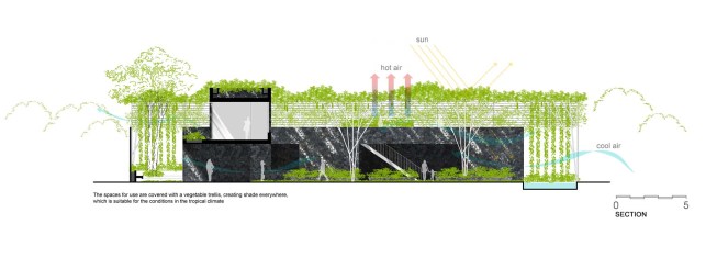 The project was built with the aim of reducing climate change. When the construction came into operation, reality has showed that the space is very clean because the air is filtered by a vegetable trellis above. This is a really energy-efficient project as almost only sunlight is used the whole time the center is open every day (6AM – 6PM). Besides, every space is well-ventilated and we don’t need to use air conditioners.