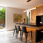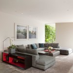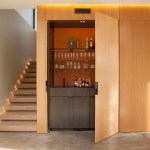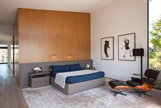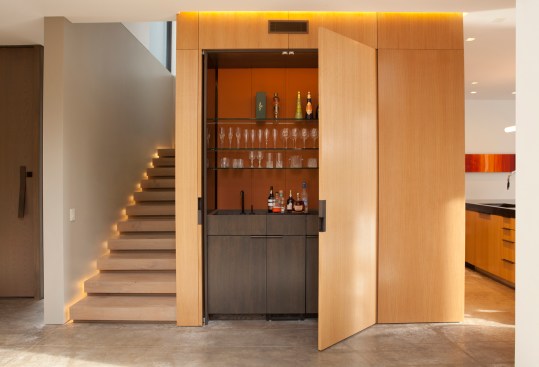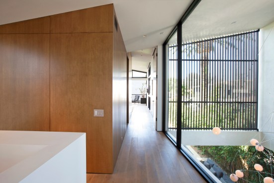 The home’s interior features the same kind of continuity. A concrete floor begins outside the front entry, and extends all the way through the house to the pool deck. Plaster walls are tinted the same color as the floor. Sliding glass doors between the central entertaining space and the pool disappear completely behind the exterior walls when completely open.