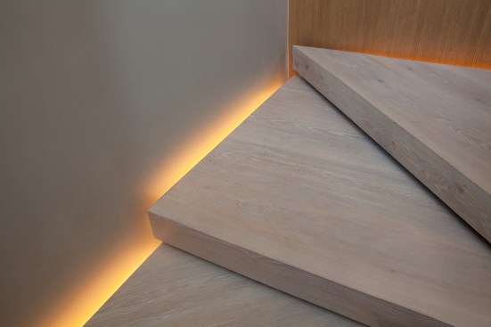 The second floor is composed of two folded white planes, each containing a bedroom suite. They interlock at the central staircase, a dramatic and airy vertical space with views of the double-height outdoor dining area.