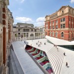 The Sackler Courtyard reveals, on all four sides, architecturally significant façades that had previously been hidden, including the sgraffito façade on the Henry Cole Wing, which has never been on public view. The café roof is covered in a further 4,300 handmade porcelain tiles and will be furnished with the 8mm Chair designed especially for the V&A by AL_A. The gates to the courtyard and the café will be open from 8.30am to encourage people to stop for coffee on their way to work or study or as they wait to enter the Museum.