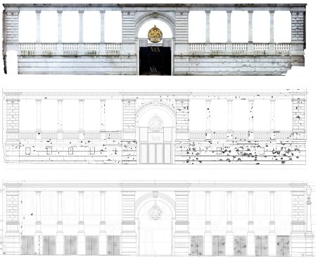 Despite opening up the Screen, the entrance to the Museum has to be closed at night. AL_A found significance in the living history of the Museum fabric and the Screen’s stonework that retains the physical scars that World War II inflicted on the Museum. New perforated gates have been manufactured that reference the absence of the stonework we have removed from the Screen, becoming a beautiful way of mapping the imprint of shrapnel damage. The gates resolve the paradox of resilience and permeability, memorialising the past as well as celebrating the future.