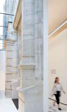 Three bays of the Western Range have been cut to create a new entrance to the Blavatnik Hall and the Museum, exposing the elegant profile of the stonework and becoming an eloquent example of the power of revealing more by subtraction than by addition. The Hall is new entrance space in the existing building and a seamless connection to the V&A, linking to the Ho and Hintze Galleries and with views through to the heart of the V&A, the Madejski