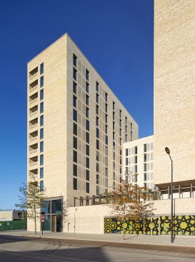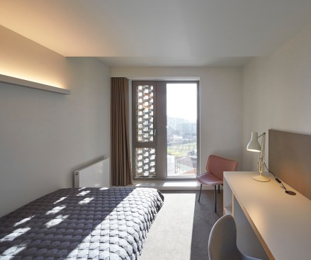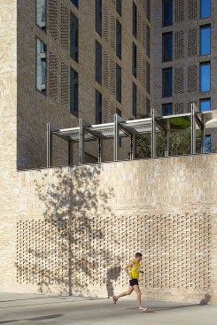 The Victoria Hall student residential building provides 198 bedrooms for use by graduate students attending an independent research university in London, as well as students coming from around the world to study in the city. The scheme has been developed by a London based developer on behalf of a network of private, neo-denominational development agencies which operates programmes and institutions which span the educational ladder. Victoria Hall is located within the King’s Cross district which is currently being redeveloped through a range of major urban and transport projects. The client’s brief called for a building of outstanding architectural design that would deliver student accommodation of the highest quality, referencing the culture of the university community. The design aims to provide a stimulating and collegiate environment in its urban setting. The design draws reference from the solidity of the adobe architecture of the Middle East. The building has been conceived as a form carved from a single block, creating two 12-storey ‘bookend’ wings above a ground floor plinth, flanking a central south-facing eight storey element set back from the street. The building's volume has been designed to respond to the wider masterplan and reinforce the adjacent public spaces and the wider context. The resulting form is expressed as a textured brick surface, with all recessed areas in lighter tones. In order to maintain the visual solidity of the form, light enters the building through both fixed windows and hit and miss brickwork, animating the interior living spaces with dappled light. This form and approach to building envelope also maximises access to natural daylight and ventilation throughout all areas. Central to the building’s character are the two courtyard gardens on the first and eighth floors that have been designed with reference to Islamic gardens found in the Andalusia region of the south of Spain, and the courtyard gardens of Morocco. Lush planting, water features and high quality stonework form the generous open communal spaces that allow residents opportunities for recreation and social interaction. The student experience was of paramount importance from the start of the project and regular stakeholder meetings were held at each stage including student bodies, staff, and key members of the client body, including the project steering committee. As a result, the design incorporates high quality, generous amenity space, shared social spaces and landscaped gardens for the residents and wider students to enjoy. The building is also adjacent to public space that has been proposed as part of the wider masterplan. Meetings with planning and the wider development team were regularly held to ensure that the building, whilst remaining primarily private, responded to the existing masterplan and future community. This ensures that when the wider plan is completed the building will engage well with the surrounding context and the students at Victoria Hall will be able to engage with the local community and enjoy the benefits of the King’s Cross development. Sustainability Victoria Hall is successful in addressing the boarder aspects of sustainability in many different ways. The building achieved a strong BREEAM 2011 NC ‘Excellent’ certification, and through the utilisation of this scheme was able to realise a number of sustainability goals. The building is connected to the T1 district energy centre at Kings Cross, one of three energy centres across the masterplan containing low-carbon and low NOx CHP engines. All electricity at T5 is derived from this energy centre, which results in a 41.4% reduction in CO2 emissions over the notional baseline. Additionally, approximately 88 m2 of PV panels have been installed on the roof of T5, further adding to the green vision that this building delivers. Victoria Hall is naturally ventilated, which greatly reduces the consumption of energy that is usually associated with cooling plant and distribution equipment, consequently resulting in reduced carbon emissions for the development. A BMS system has been installed to allow the operational team to monitor and assess energy and water consumption over the building’s life, allowing future modifications and potential energy savings to be realised. Flow control devices and water leak detection were installed, and these actions tie in with the goals of UK Government’s “Future Water” Strategy for England, and Victoria Hall arguably contributes towards wider national goals for sustainable water usage. The maximum allowable number of credits were achieved for the BREEAM Mat01 section, which shows that careful material specifications and selection for elements such as the external walls/facade, roof, floors and glazing resulted in the use of materials with very low quantities of associated carbon over their projected lifecycles. All timber for the project was form FSC/PEFC-certified sources, and a biodiverse roof was installed to help improve site ecology.