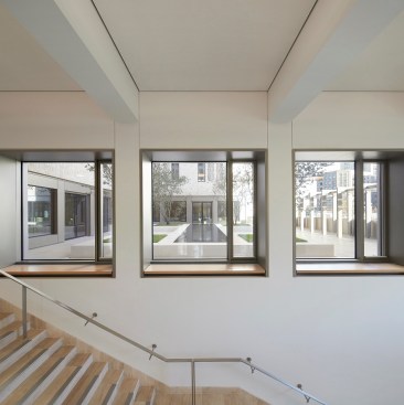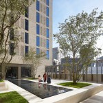 Victoria Hall is a 198-room student housing tower in the rapidly rebranding London district of King’s Cross, developed by a private development agency. Designed by local firm Stanton Williams, the structure consists of two 12-story wings connected by an eight-story volume, creating a sheltered courtyard atop the complex’s ground-floor plinth.