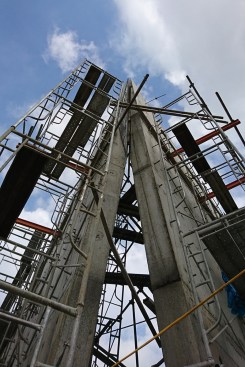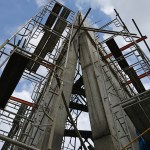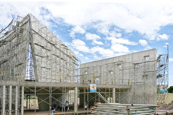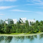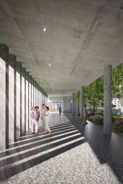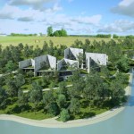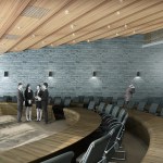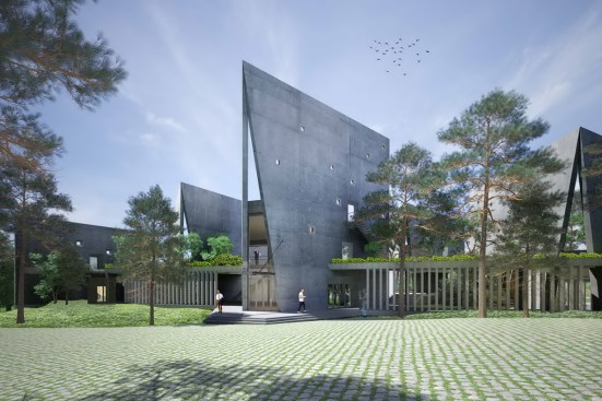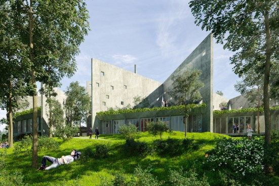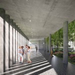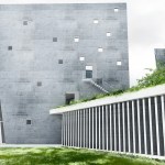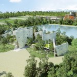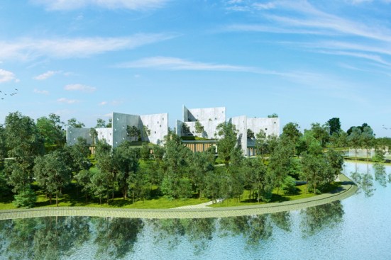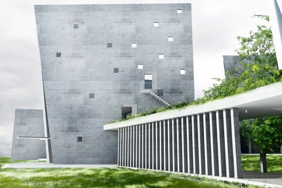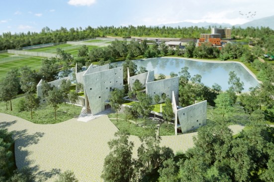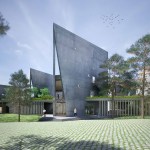 The studios are opened to North direction where offers most beautiful greenery view to people. The V-shaped walls are designed to be high to cut strong harsh sunlight from East and West direction with giving impressive exterior facade for the entrants. The roof garden will works as outside studio. The small holes on the wall will provide gentle lights and wind to the roof studio.