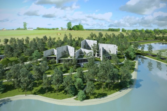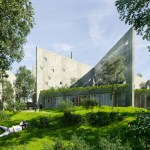 There are six V-shaped wall-blocks which freely arranged follow the lay of land and connected by an open corridor. These blocks form triangular surface spaces: two sides closed and the other side opens towards lake and trees. The walls create an open book shape that exhibits “open from inside to nature”. While the open side directly faces to surrounding environment allow people to both relax, be immersed in nature and concentrate.