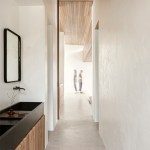 Natural materials, in both the main home and the guest houses, complement the plastered concrete construction and nod to the wild Mediterranean vegetation around the site. As a result, the interiors are modern, but also feel tactile and richly textured. The floors are either natural stone or terrazzo made locally by a specialist craftsman. A contemporary wooden ceiling made of teak slats becomes a central feature in the living spaces. At the same time, bespoke solid timber doors en-hance the overall sense that this retreat is anchored in its site, intrinsically connected to its context.