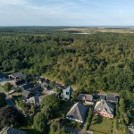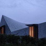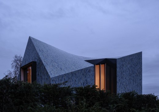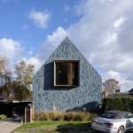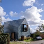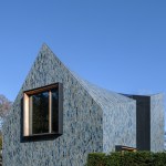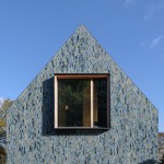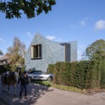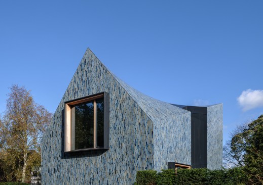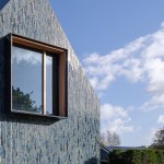 Colour use is consistent with the shades of the environment, ensuring that the villa is absorbed in the changing terrain. The dune and polder landscape in various seasons is mirrored in the design’s colour spectrum consisting of 5 shades of grey, green and blue. The glaze of the tiles is vibrant, glossy and has an iridescent effect, creating a pearlescent appearance on the tiles, also influencing the incidence of light on the appearance of the façade and roof.